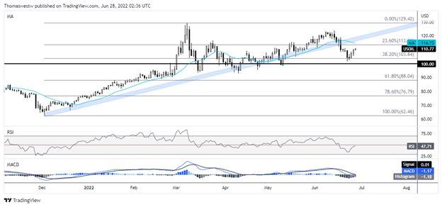 The 23.6% Fibonacci retracement level and the falling 20-day Simple Moving Average (SMA) may serve as confluent resistance if prices continue to rise after bouncing off the 38.2% fib level. A break higher would have bulls aim at the December 2021 trendline. Alternatively, the 38.2% fib may provide some resistance if the rally reverses.